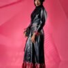 A leather piece designed as a jacket- dress with a touch of premium cationic chiffon to give it the soft/ feminine look. It comes with three colored braided tassel belt to add more style but can be worn without the belt.